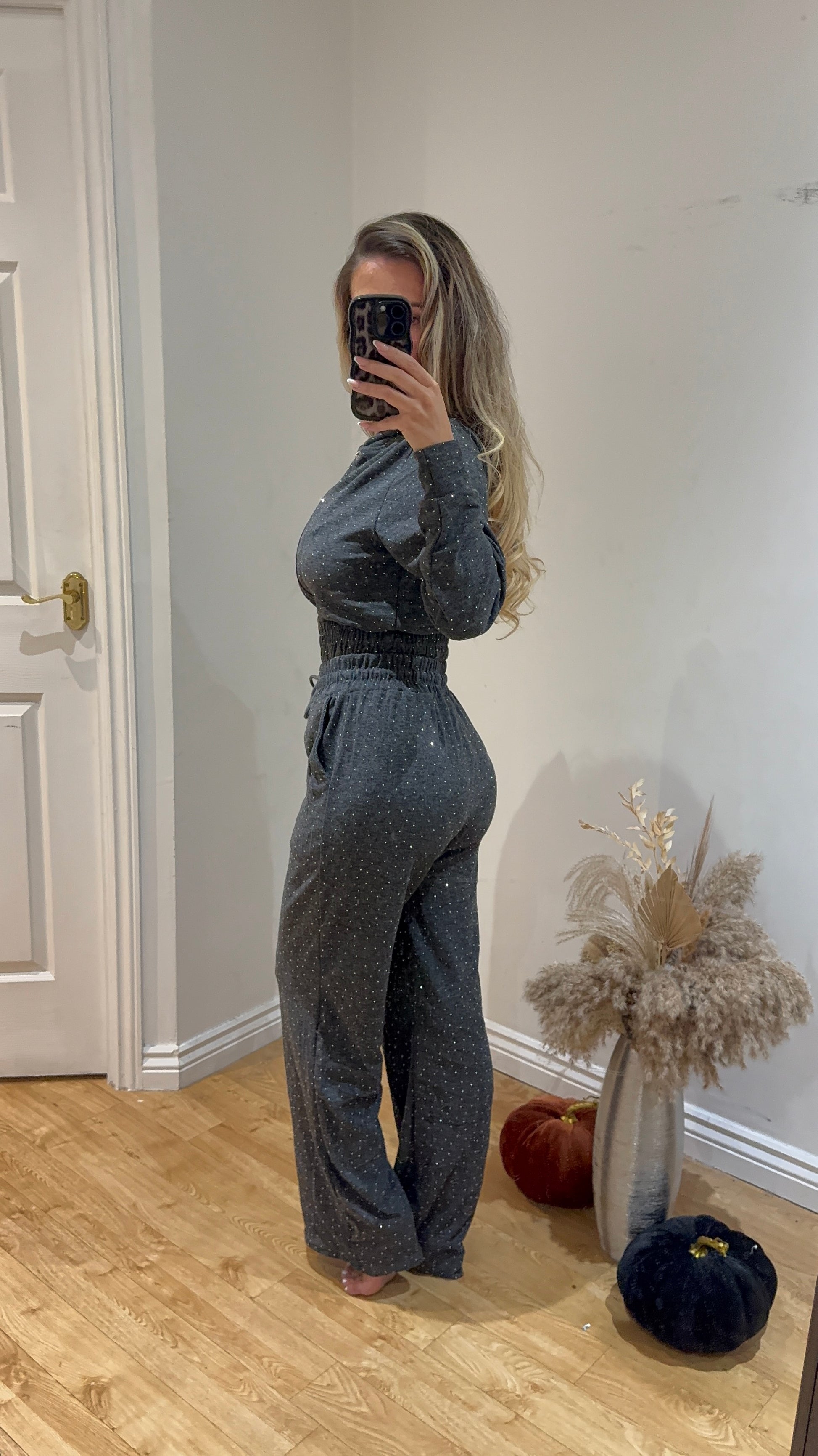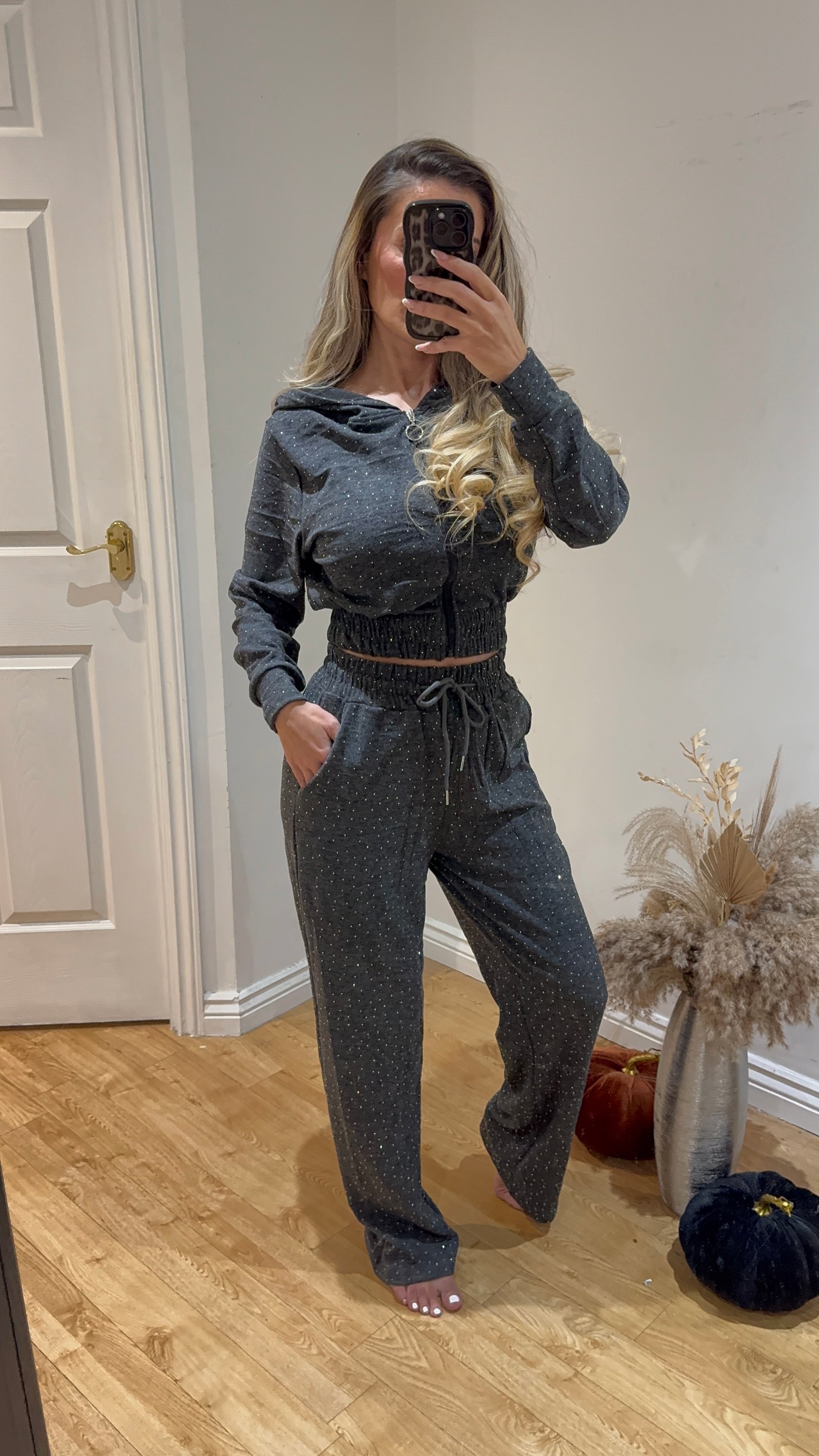 Turn heads in effortless style with our Rhinestone Charcoal Track Set. This chic two-piece features a cropped hooded top adorned with sparkling rhinestone details and high-waisted trousers with a thick, figure-flattering waistband. Designed for comfort and confidence, it blends streetwear edge with a touch of glam — perfect for coffee runs, travel days, or casual nights out.